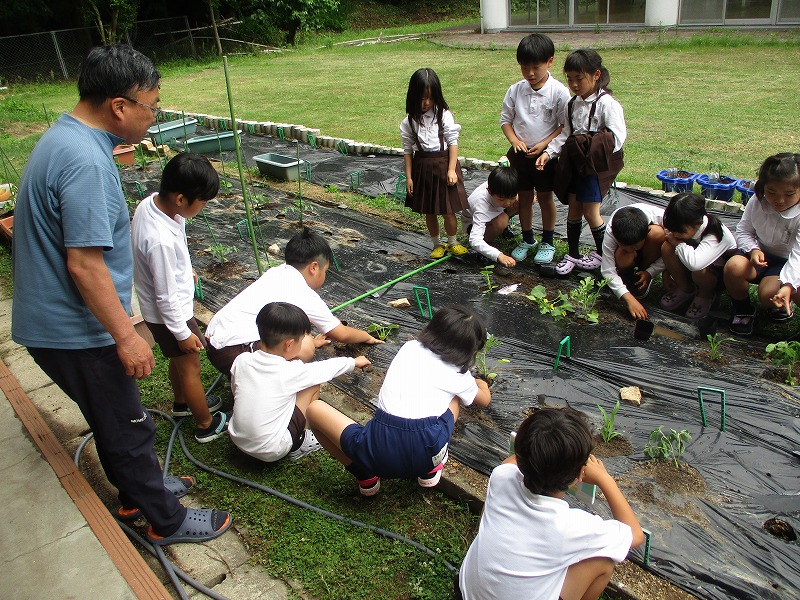 1.2年生の生活科には、植物を育てる活動があります。育つ場所、変化や成長の様子に関心をもったり、生き物への親しみをもち大切にしようとしたりすることができます。この時期、1年生はあさがおを植えます。自分の鉢に、土を入れて穴をあけ、種を植えました。小さい種を落とさないように大事に持って植えました。2年生は、ミニトマトや夏野菜を植えて収穫までします。根を傷めないようにポットから苗を出し、しっかり植えました。これから、水やりや草取りをしながら、大切に育てていきます。